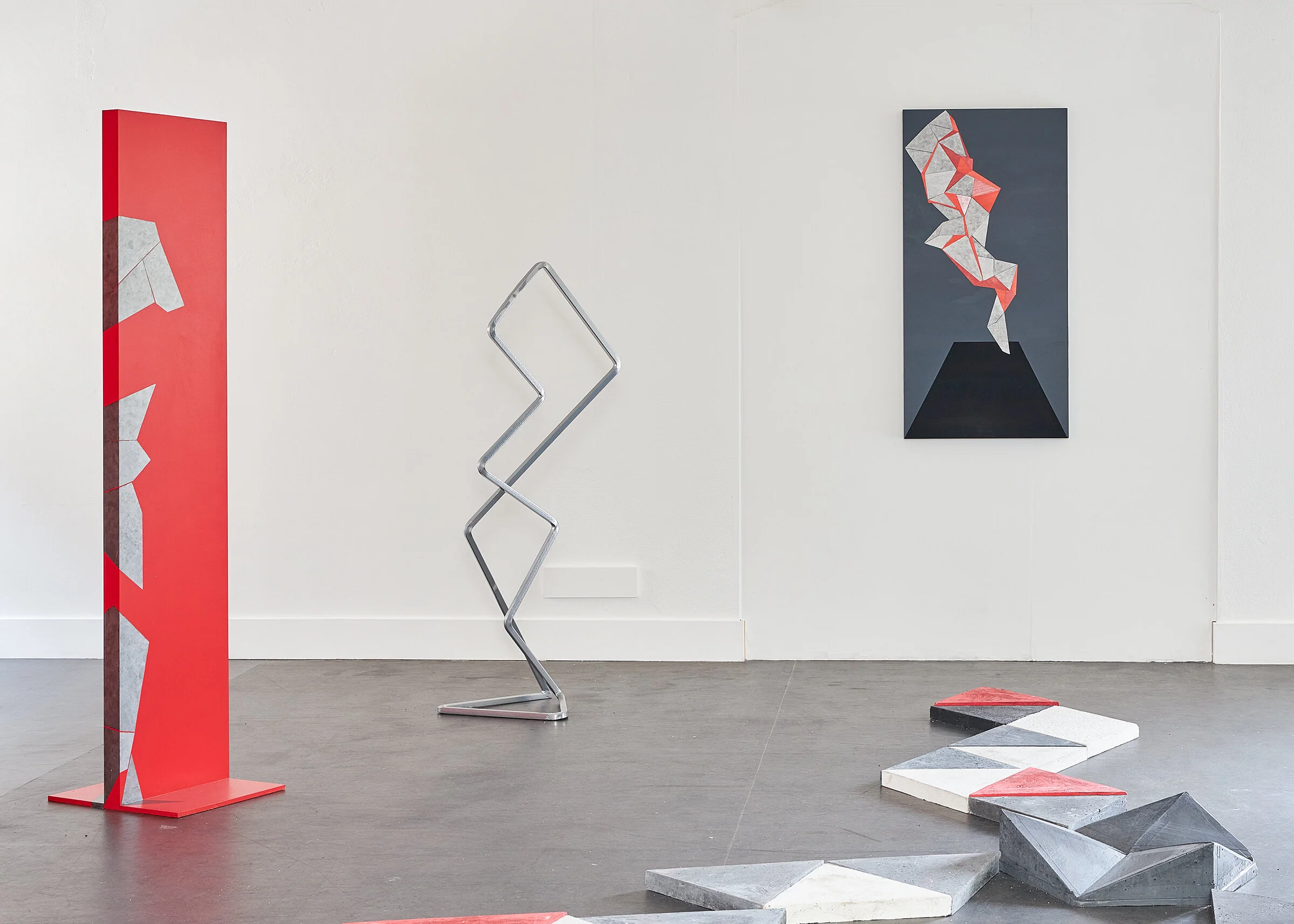 Acrylic and steel on wood panel. Acrylic and steel on pigmented cast concrete
